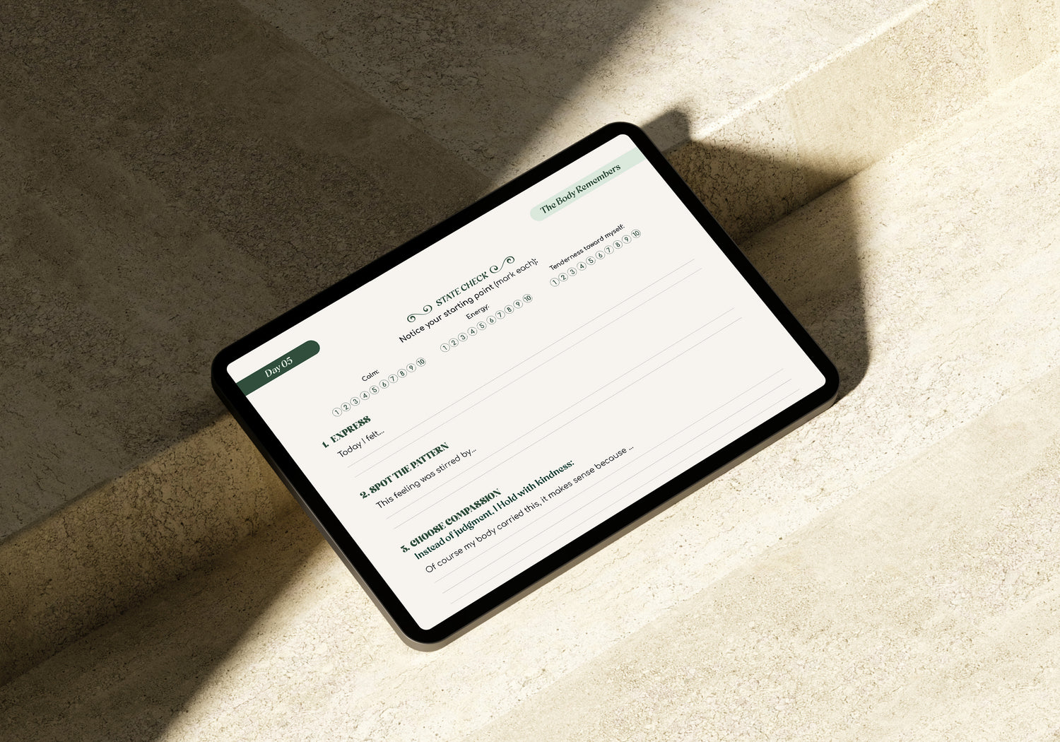 Daily guided prompts crafted to soften emotional tightness and reconnect you to yourself gently. -