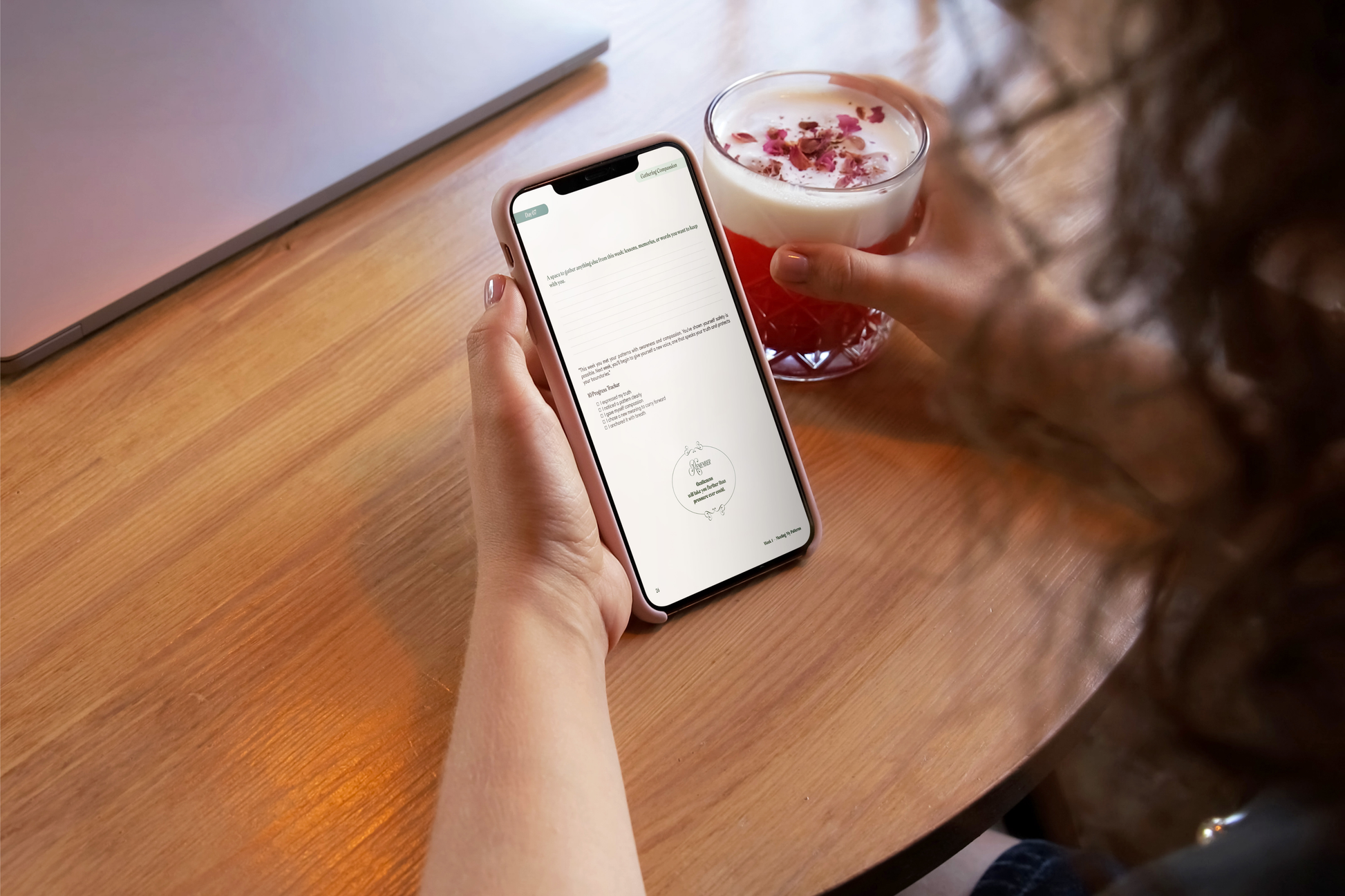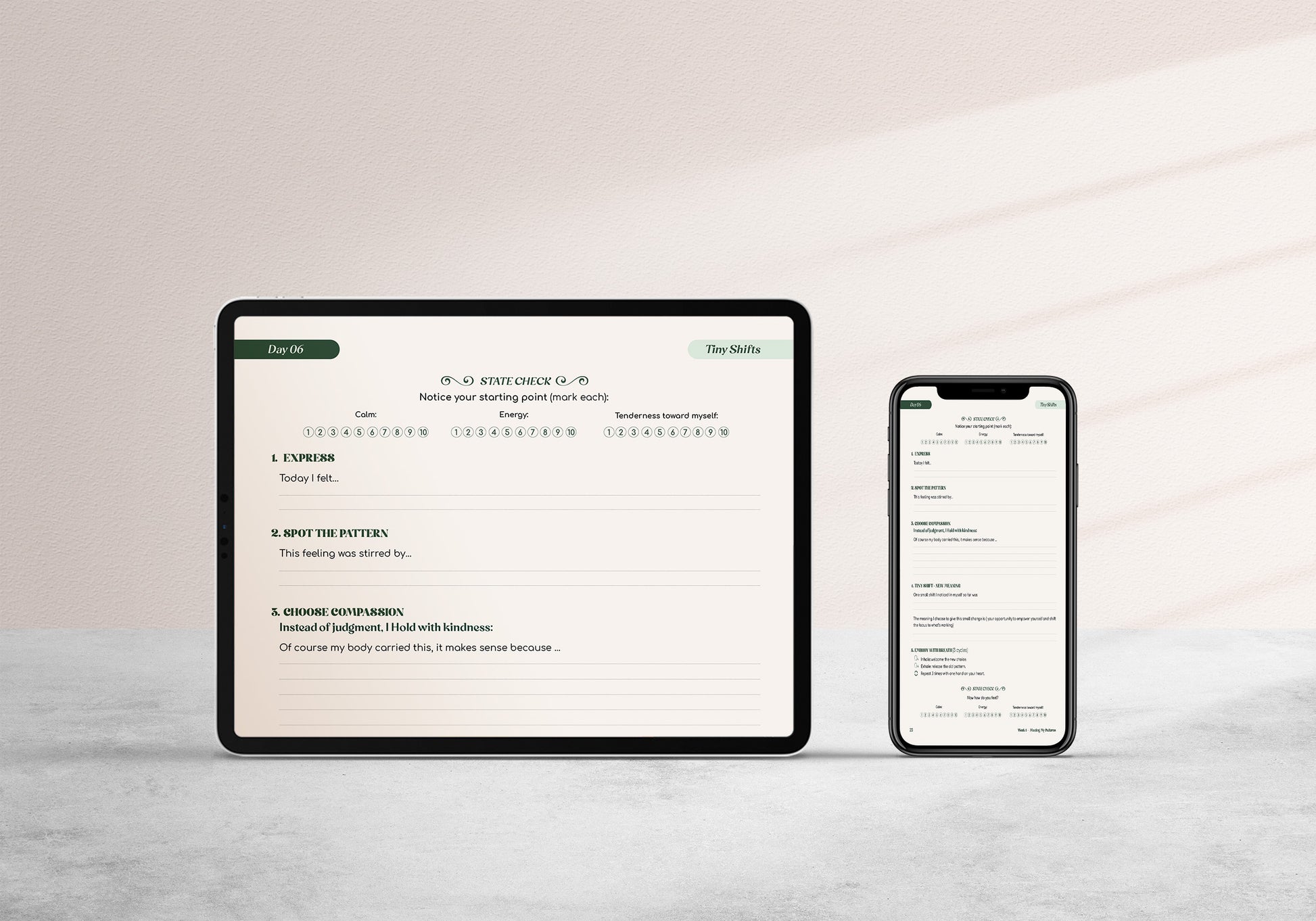 A grounding moment first. Then you follow the guiding structured, that meets you exactly where you are — not where the ideal version of you would be.